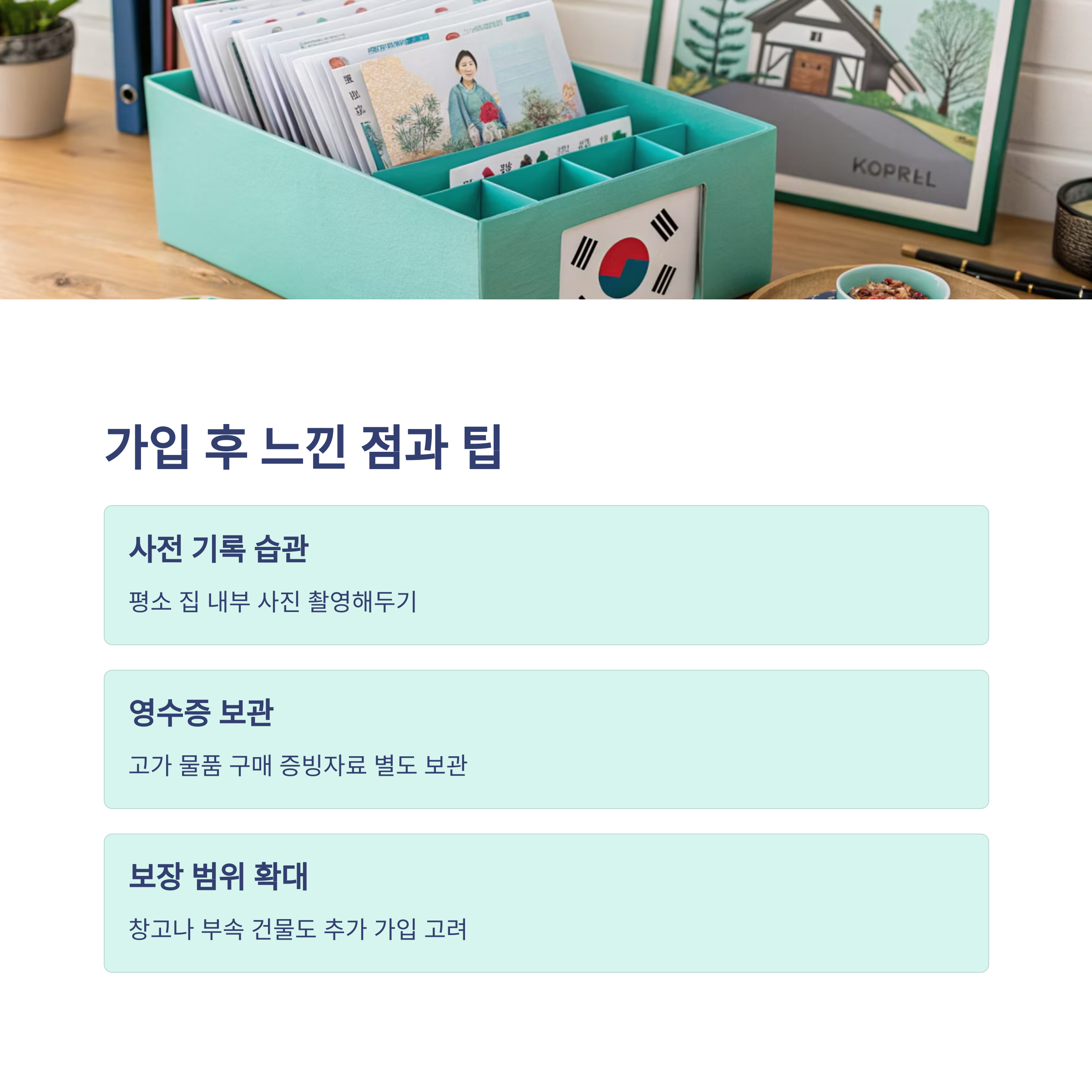 가입 이후엔 평소에도 주기적으로 집 안 사진을 찍어두는 습관이 생겼어요. 보상받을 때 '피해 전 사진'이 도움이 될 수 있거든요. 또한 고가의 전자제품이나 가구는 영수증을 따로 보관하거나 스캔해두는 게 좋아요.