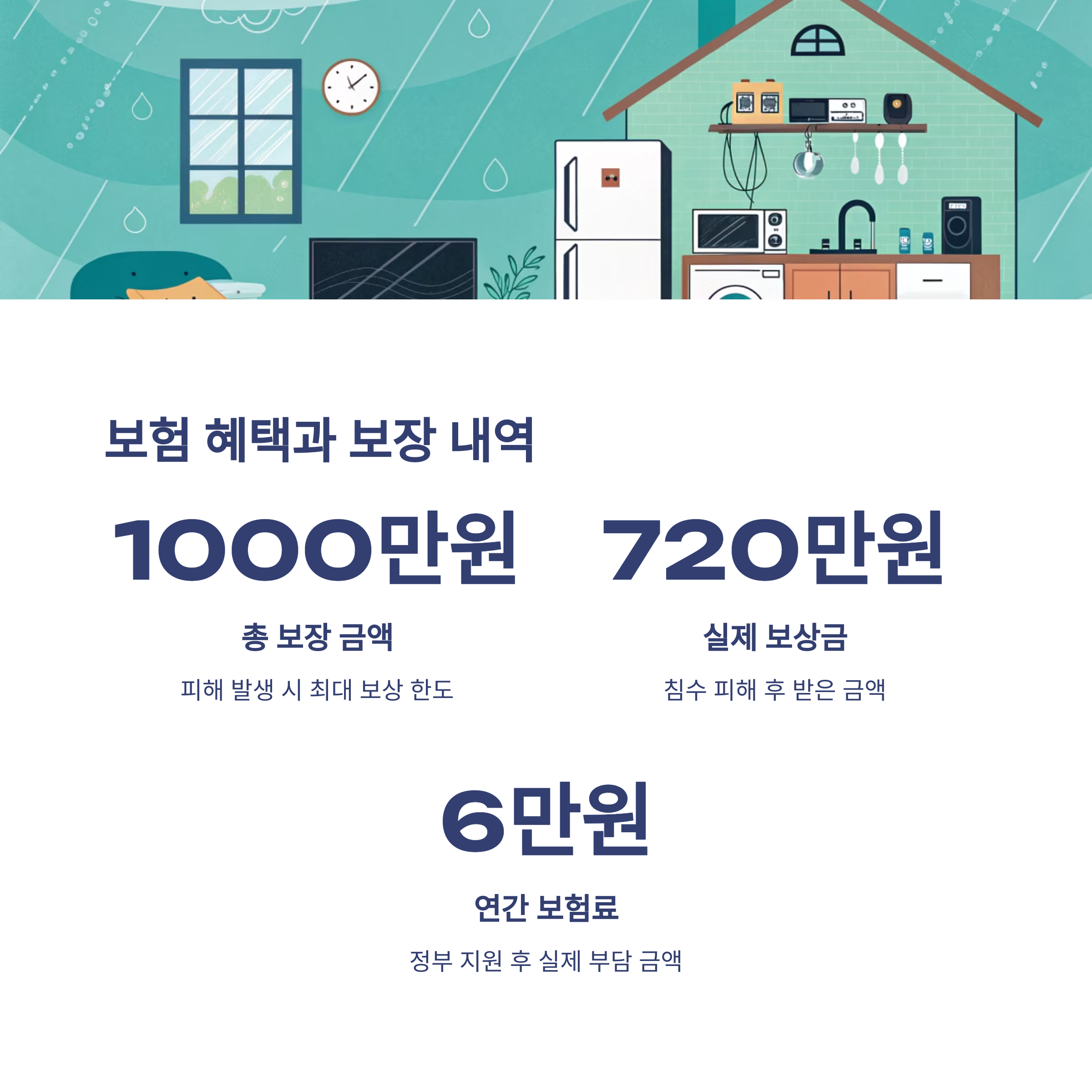 풍수해 보험은 보험료 대비 혜택이 꽤 괜찮은 편이에요. 제가 가입한 상품 기준으로 살펴보면, 총 1000만 원 상당의 보장을 받을 수 있었고 그중 실제 피해 보상금으로 약 720만 원을 지급받았어요. 보험료는 연간 6만 원대였기 때문에 투자 대비 효과는 매우 만족스러웠답니다.