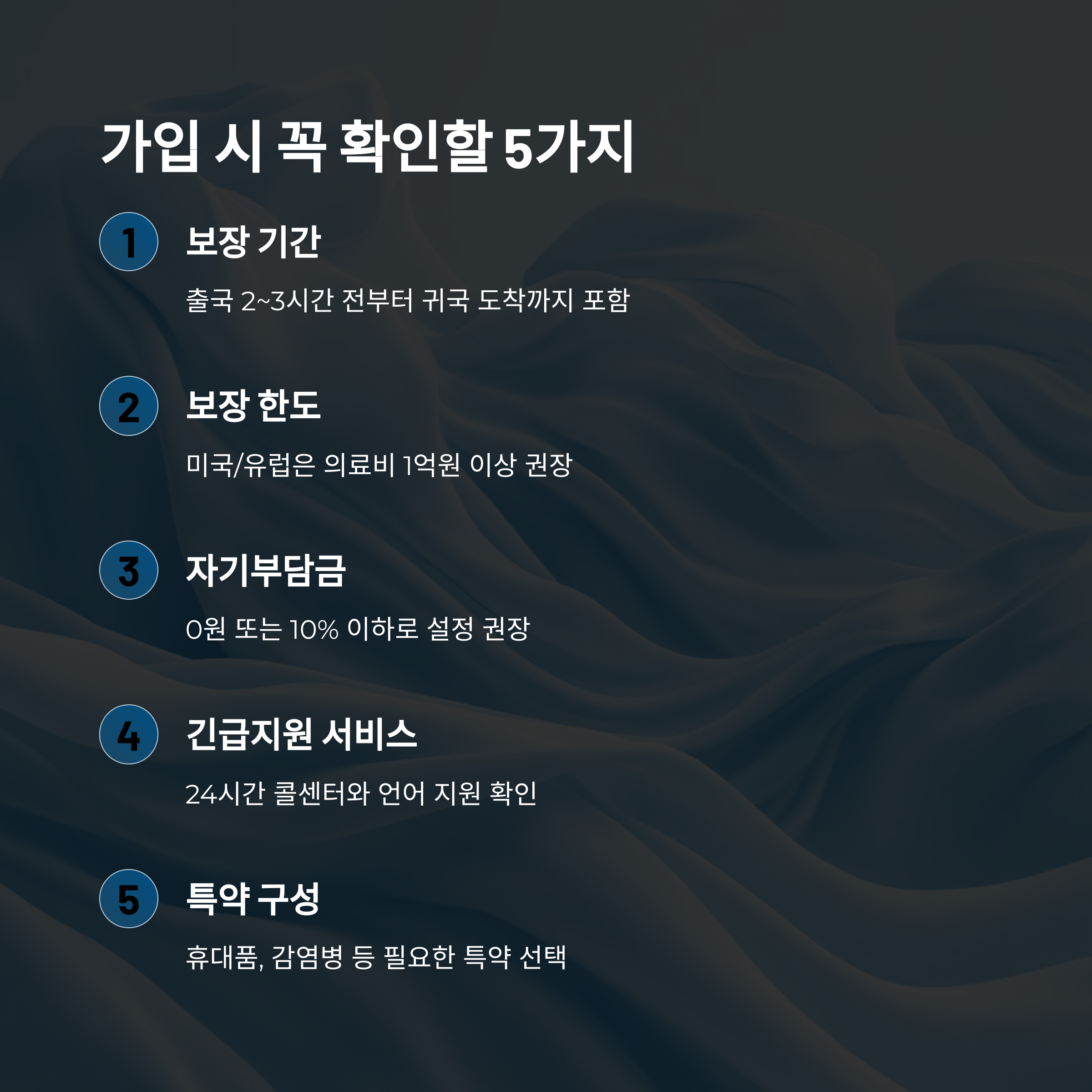 해외여행자 보험은 아무리 좋은 상품이라도 조건을 제대로 이해하지 못하면 소용이 없어요. 가입 전에 반드시 체크해야 할 포인트들을 정리해볼게요. 꼼꼼하게 살펴보면, 나중에 당황하는 일을 줄일 수 있어요!
