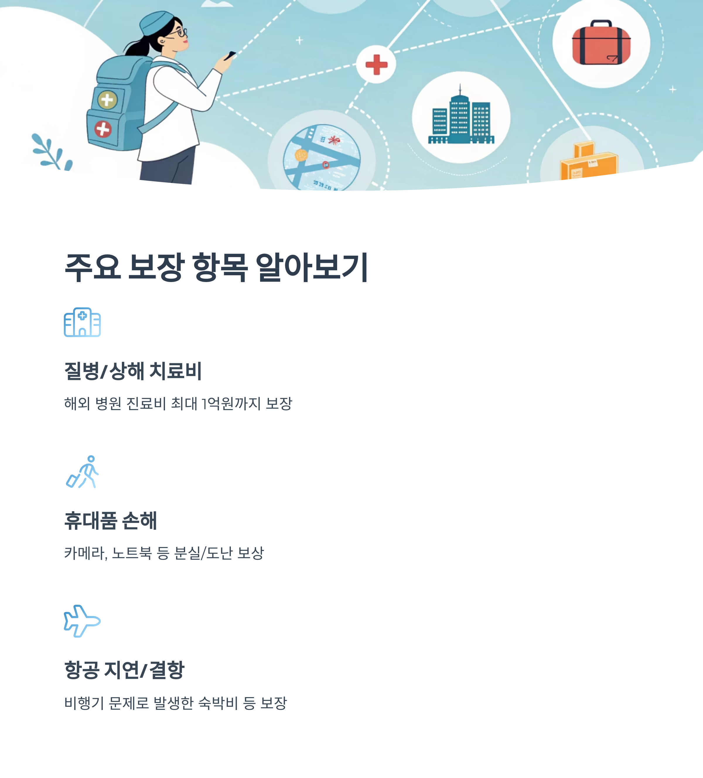 가장 기본이 되는 항목은 '해외 질병 치료비'와 '상해 치료비'예요. 이 항목은 병원비와 약값을 포함하며, 단순 감기부터 큰 사고까지 모두 적용돼요. 그 외에 상해로 인한 사망이나 후유장애 보장은 대부분 기본 포함이에요.