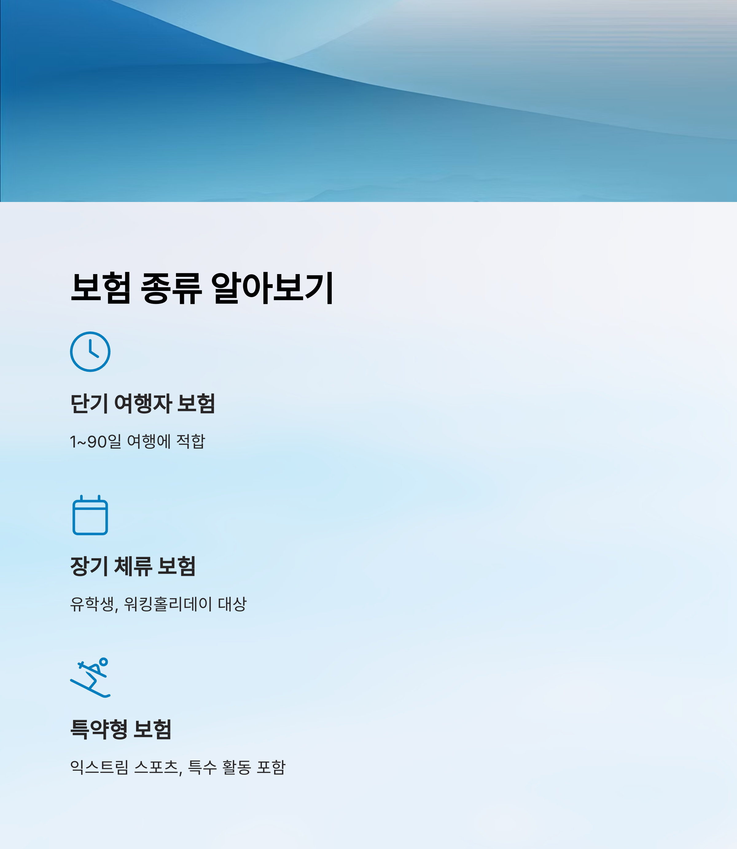 | 단기 여행자 보험 | 관광, 출장 | 1~90일 | 일반적인 해외여행자 대상 |