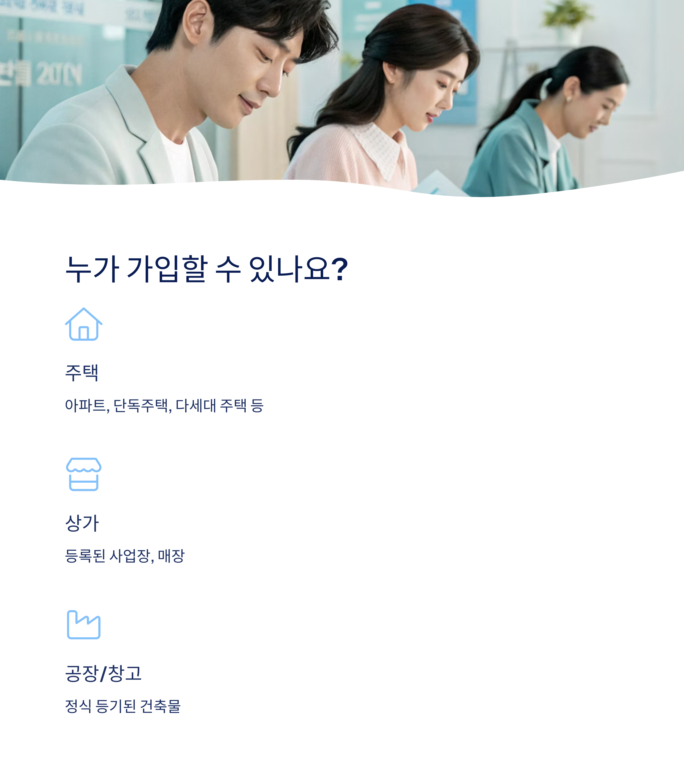 주택의 경우, 아파트, 단독주택, 다세대 주택, 연립주택 등 형태에 관계없이 가입이 가능해요. 단, 지자체가 제공하는 간이 주택이나 무허가 건물은 제외될 수 있어요. 사업장도 마찬가지로 사업자 등록이 되어 있고, 구조가 명확하다면 가입 대상이 돼요.