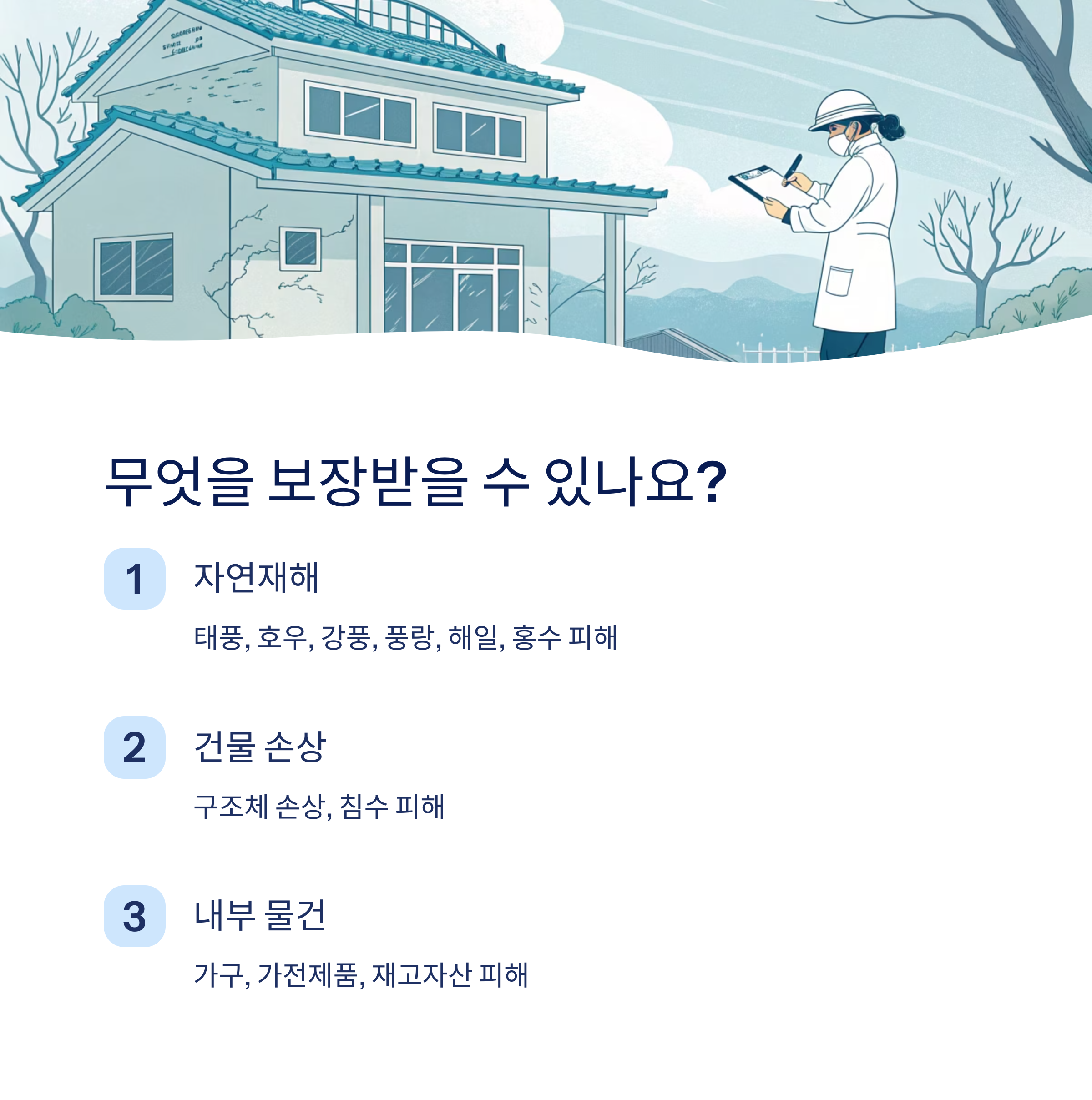 건물과 동산(가재도구, 재고자산 등)은 각각 따로 보장되기 때문에 보상 시 혼동이 없도록 분리해서 가입하는 것이 좋아요. 특히 소상공인은 매장 내 재고도 보상 대상이 되기 때문에 큰 피해 시 경제적 복구가 빨라질 수 있어요.