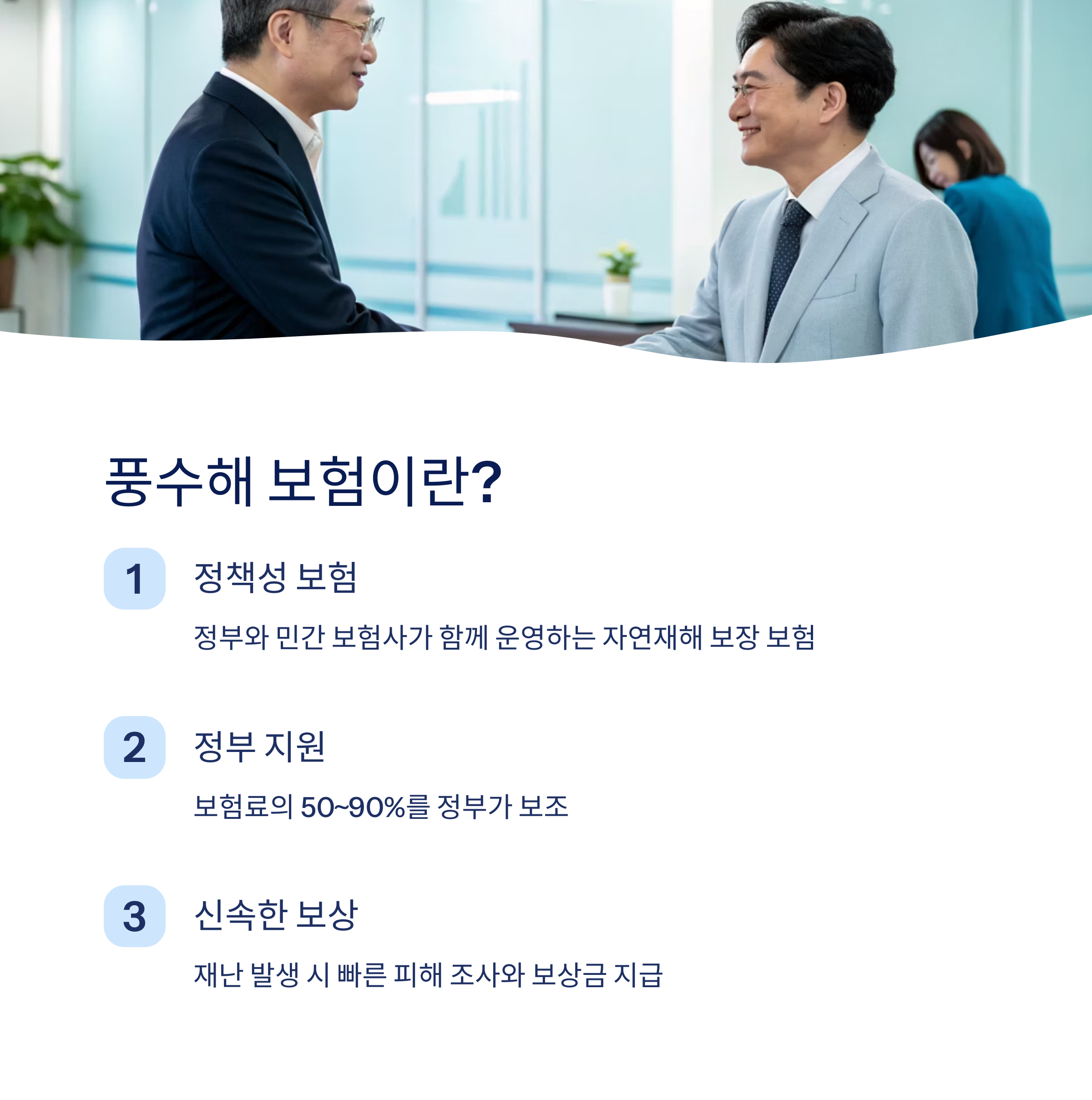 풍수해 보험은 태풍, 홍수, 폭우, 폭설, 강풍 등 자연재해로 인한 피해를 보상해주는 정책성 보험이에요. 정부와 민간 보험사가 함께 운영하며, 보험료 일부를 국가에서 지원해주기 때문에 저렴하게 가입할 수 있는 것이 큰 장점이에요.