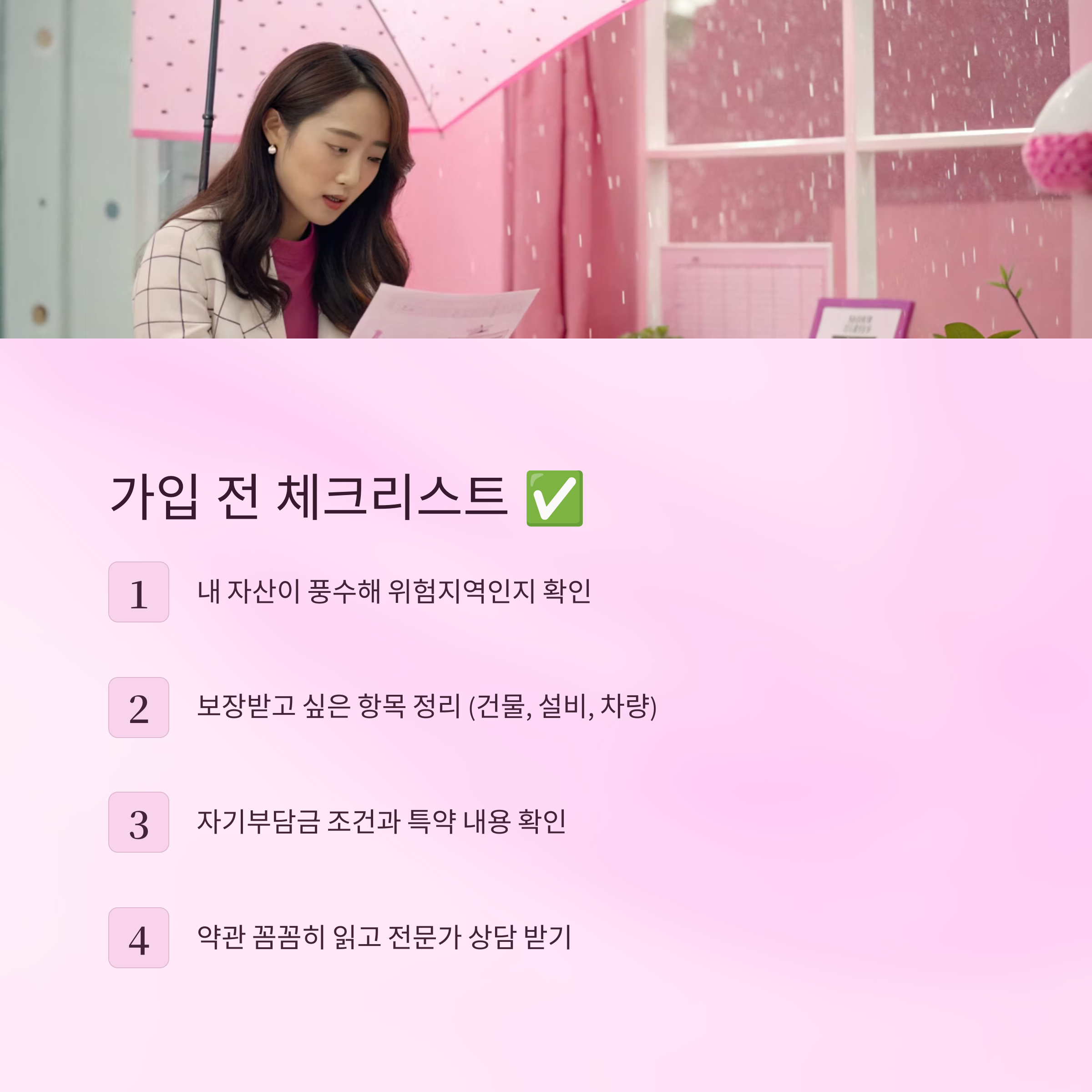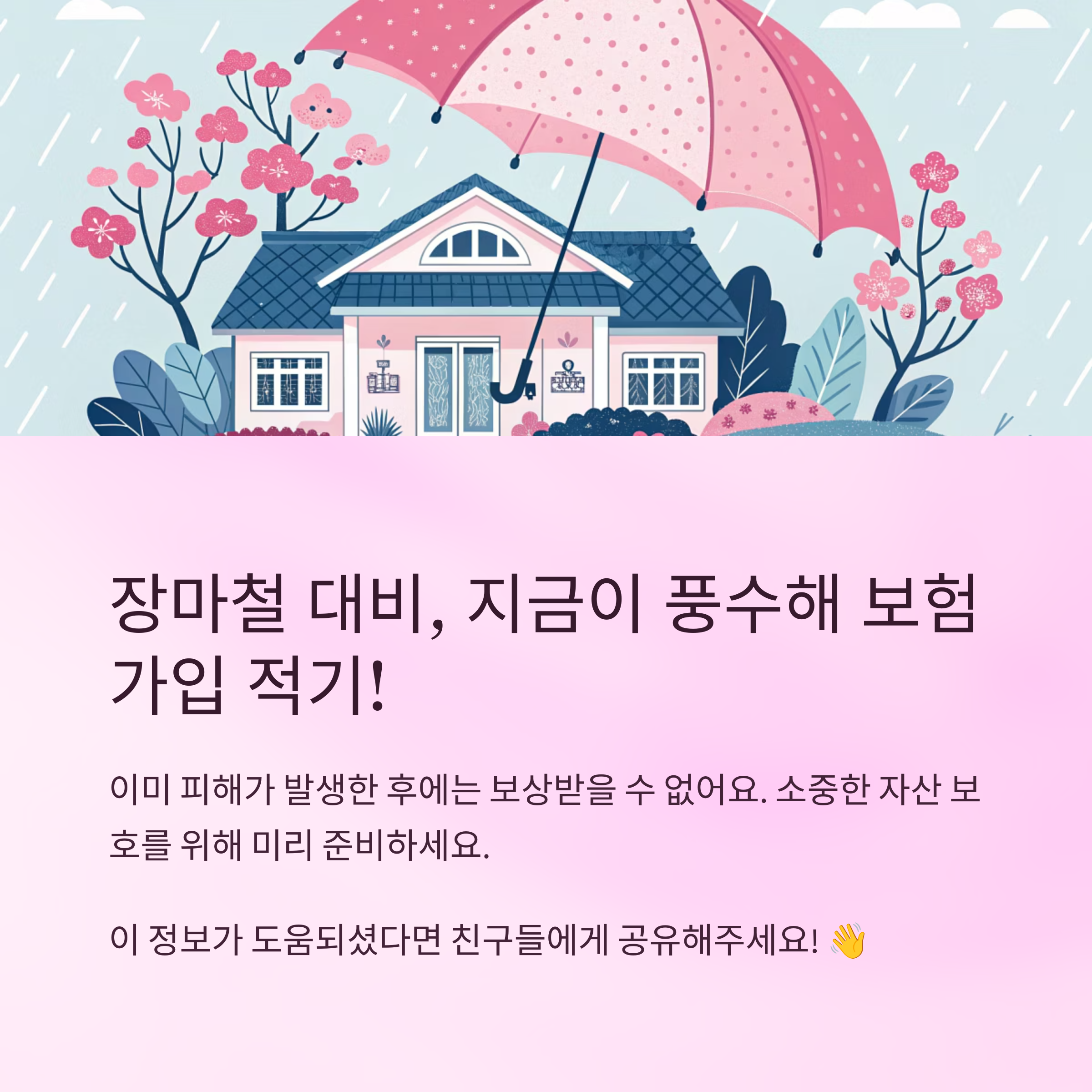 이 체크리스트를 통해 나에게 맞는 풍수해 보험을 현명하게 설계하면, 갑작스러운 재난 상황에도 큰 도움이 될 수 있어요. 😉