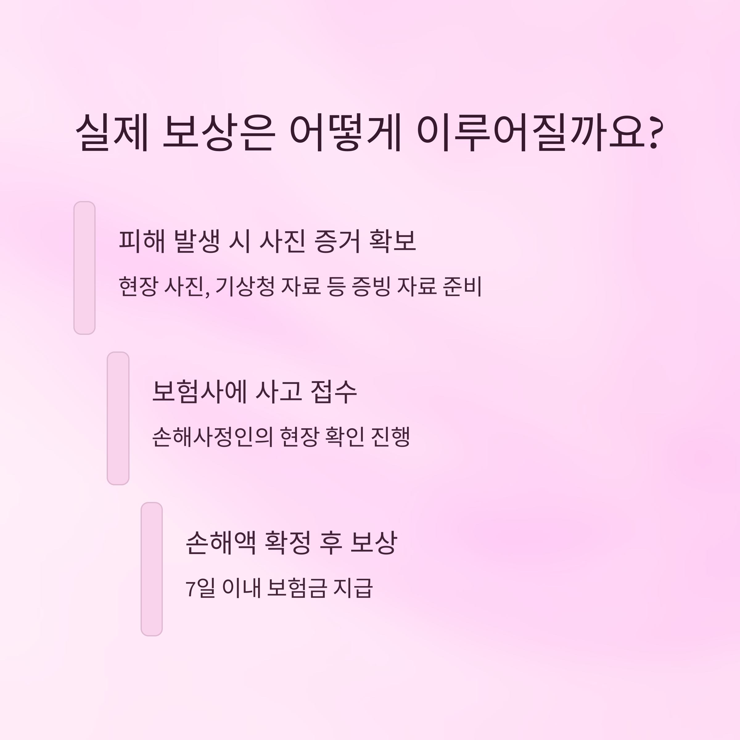 이 표처럼 구체적인 보상 조건을 미리 알아두면, 실제 사고 시 당황하지 않고 필요한 절차를 잘 진행할 수 있어요. 풍수해처럼 예상이 어려운 피해일수록 사전 준비가 정말 중요하답니다. 🌧️