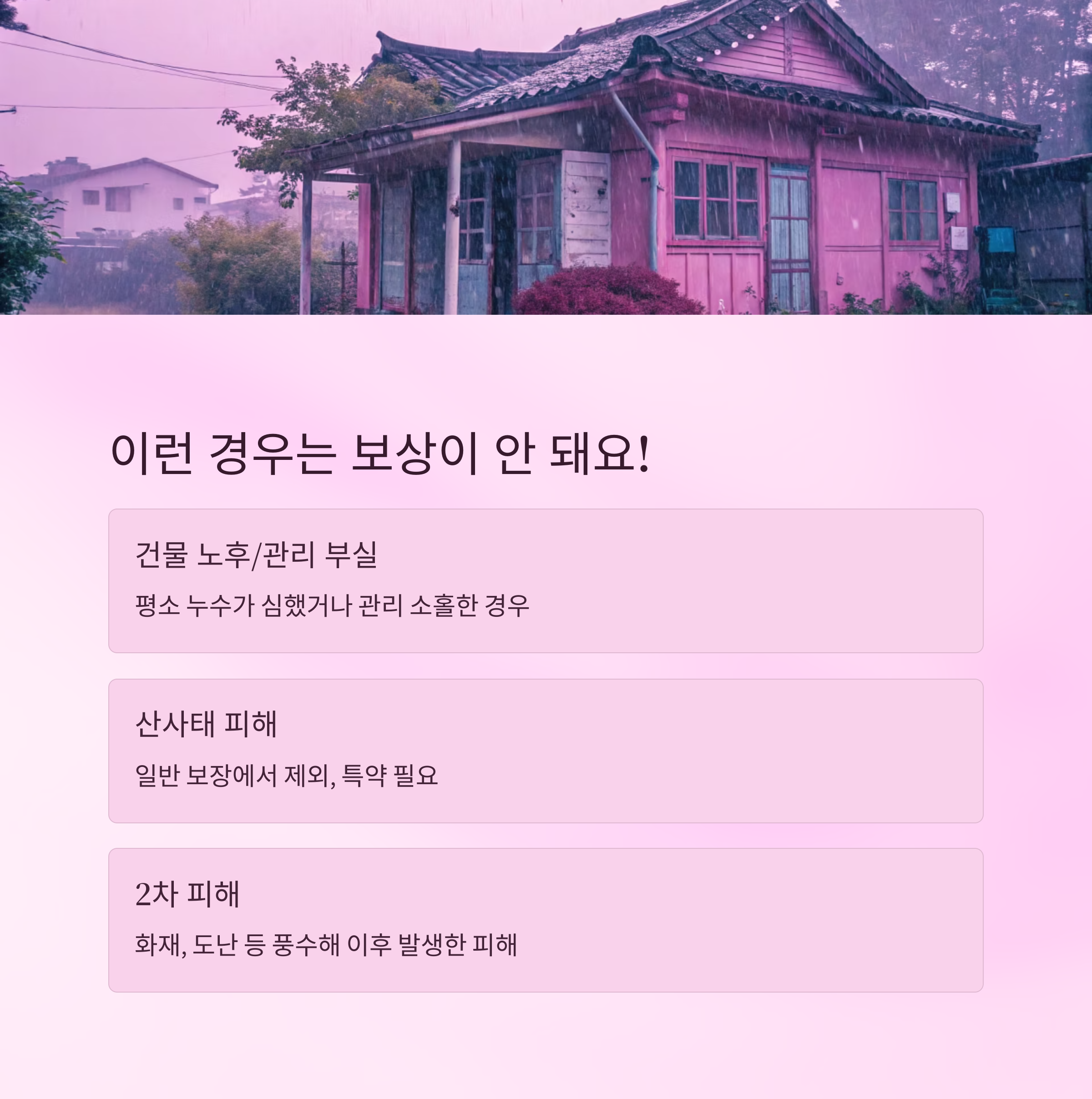 예를 들어, 건물이 이미 오래되어 누수가 심했거나, 하수도가 막힌 상태에서 비가 들어와 생긴 피해는 자연재해로 보지 않기 때문에 보상이 되지 않아요. 이건 보험사의 입장에서도 관리 소홀로 판단하는 경우가 많기 때문이에요.