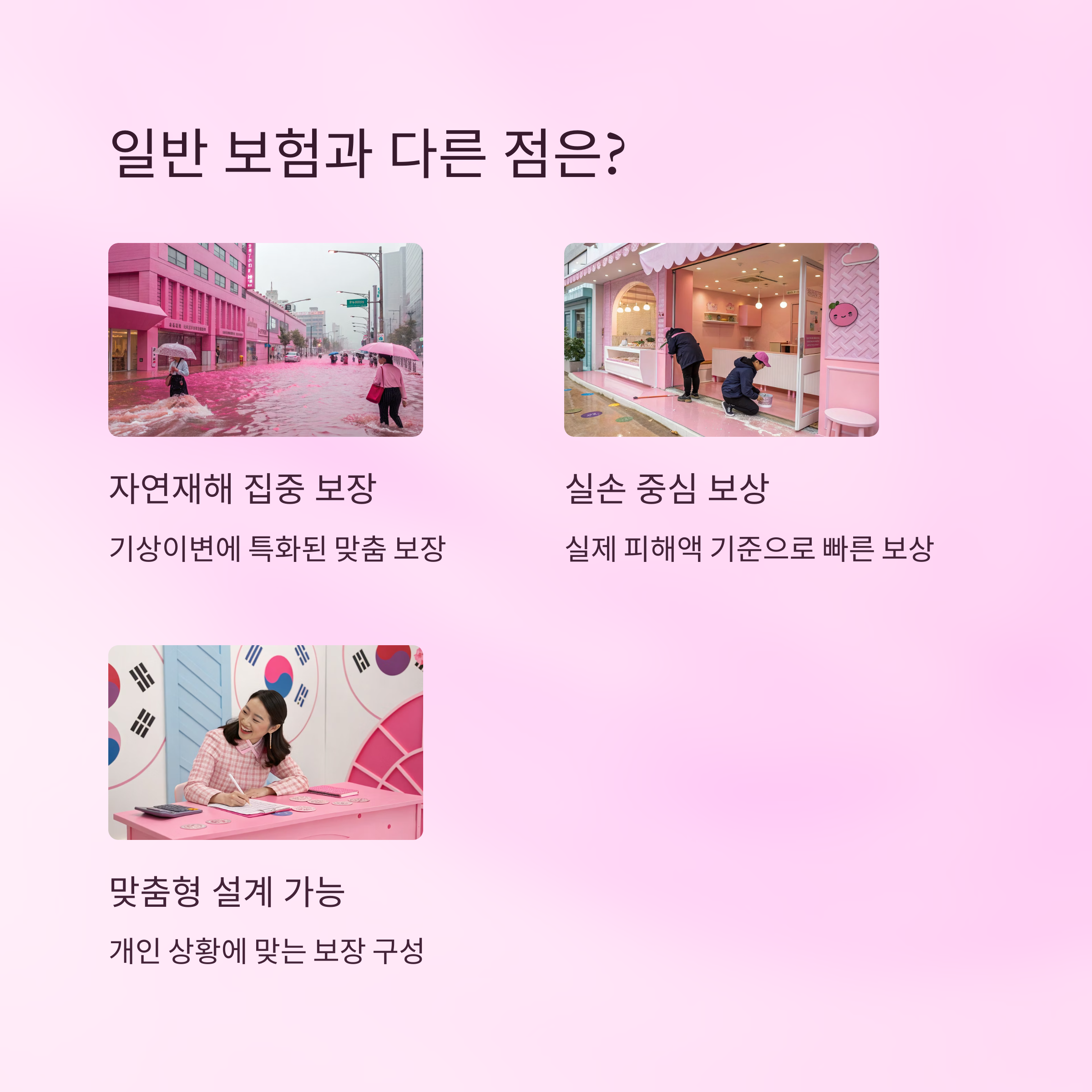 풍수해 보험은 일반 화재보험이나 재산보험과는 다르게 ‘자연현상에 따른 피해’에 집중하고 있기 때문에, 피해의 범위와 조건이 더욱 명확하게 정리되어 있어요. 때문에 소상공인, 자영업자, 주택 소유자 등 다양한 계층이 관심을 가져야 하는 보험 상품이죠.