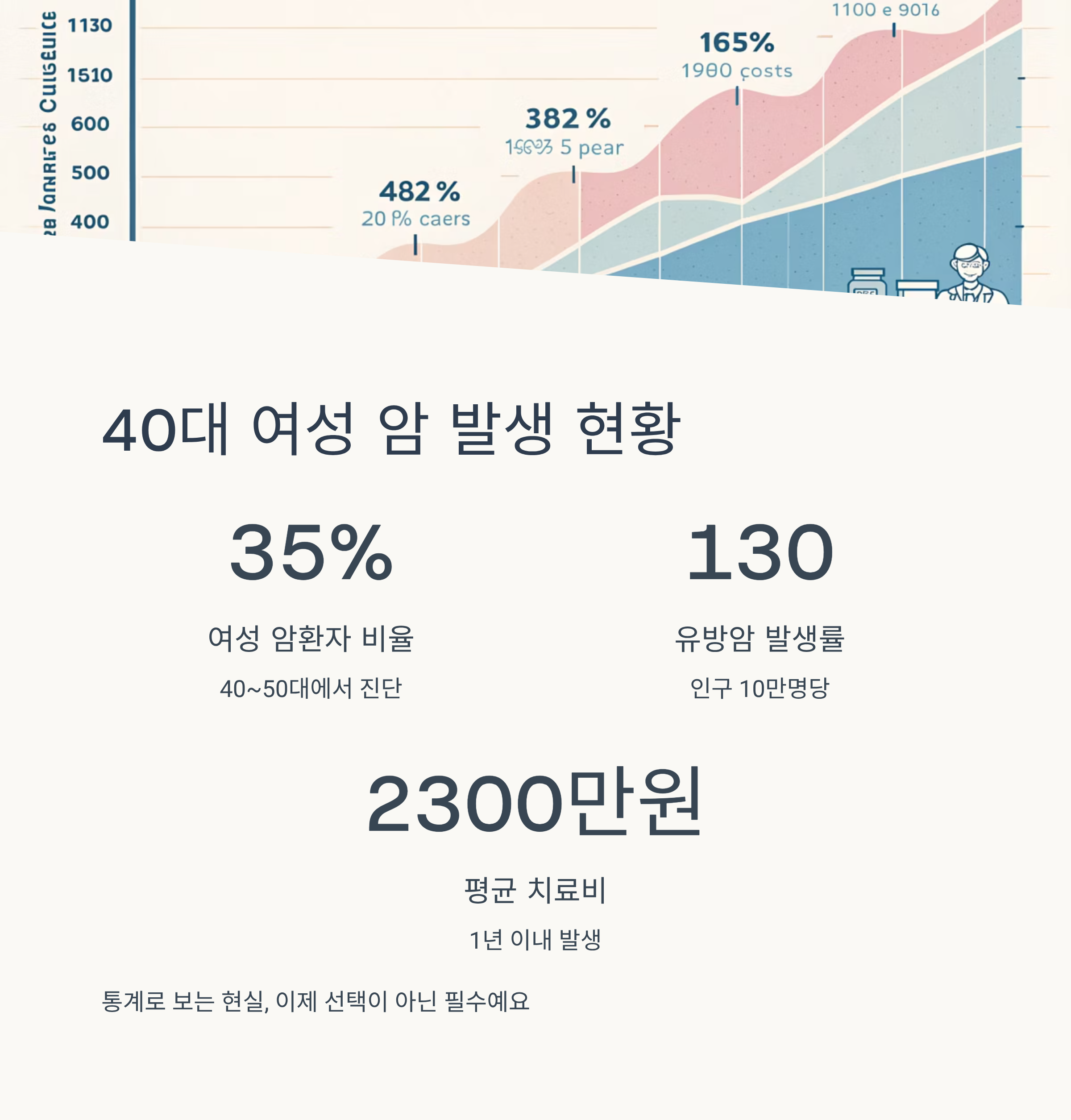 40대에 들어서면 대부분의 여성들이 건강에 대해 이전보다 훨씬 더 민감해지기 시작해요. 단순히 주기적인 건강검진을 넘어서 만약의 상황을 대비한 보험 상품에 관심이 높아지죠. 특히 여성 특화 질환 중 하나인 유방암이나 자궁경부암은 40대에 가장 많이 발생하는 암 중 하나로 꼽히고 있어요.