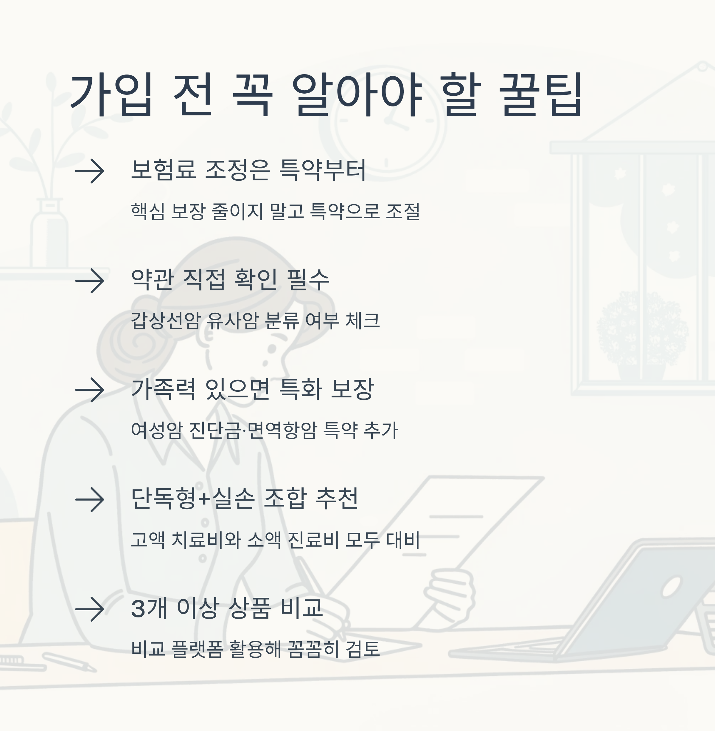 다음 섹션에서는, 실제로 암보험을 가입할 때 실수하지 않기 위한 꿀팁과 유의사항을 알려드릴게요! 보험설계사도 잘 알려주지 않는 내용들이니 꼭 읽어보세요! 🧠
