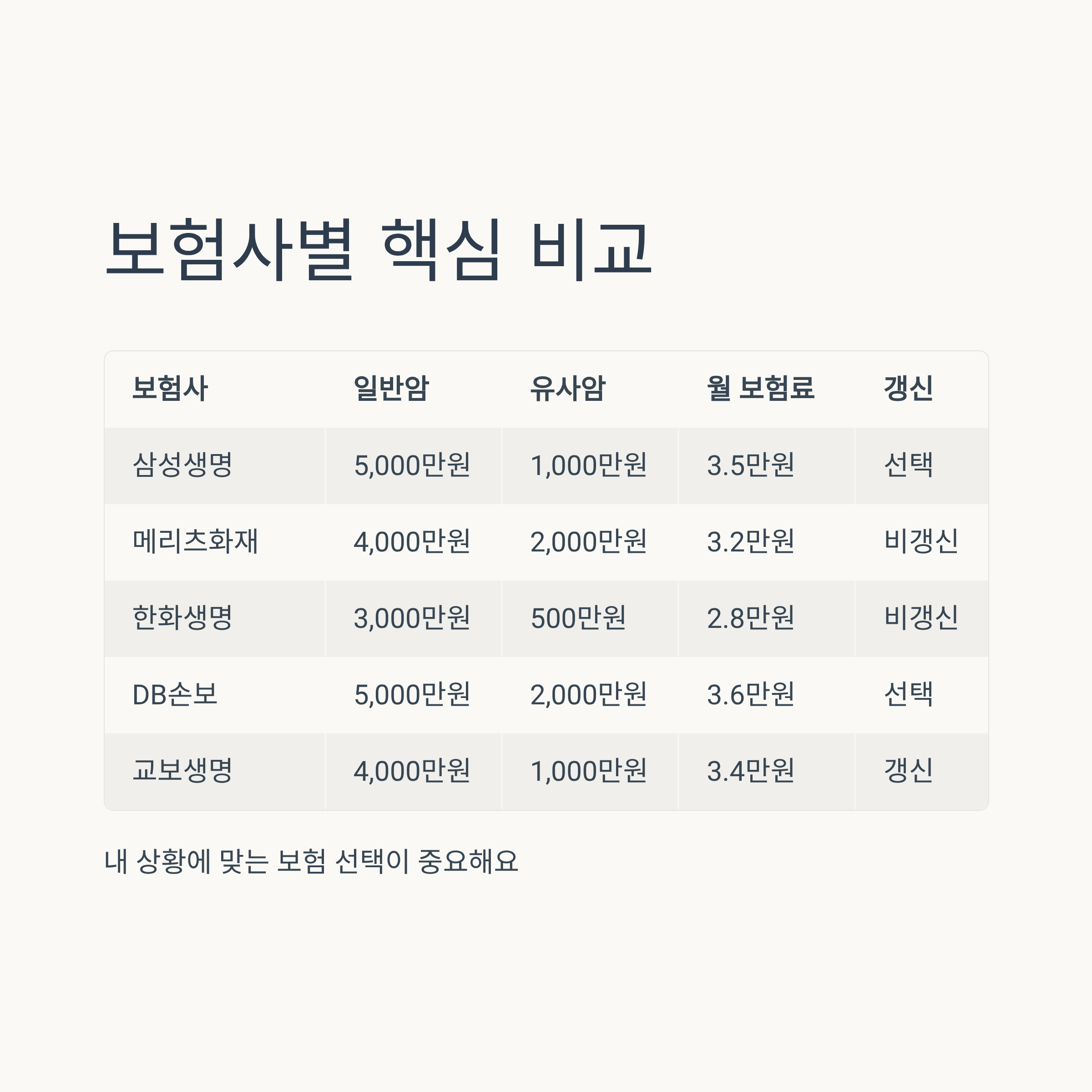 이렇게 각 보험사는 조금씩 특장점이 달라요. 자신의 건강 상태, 가족력, 재무 상황을 고려해서 맞춤형으로 선택하는 게 가장 좋아요. 다음 섹션에서는 이런 상품들을 실제로 비교할 수 있는 기준을 정리해서 보여드릴게요! 📚