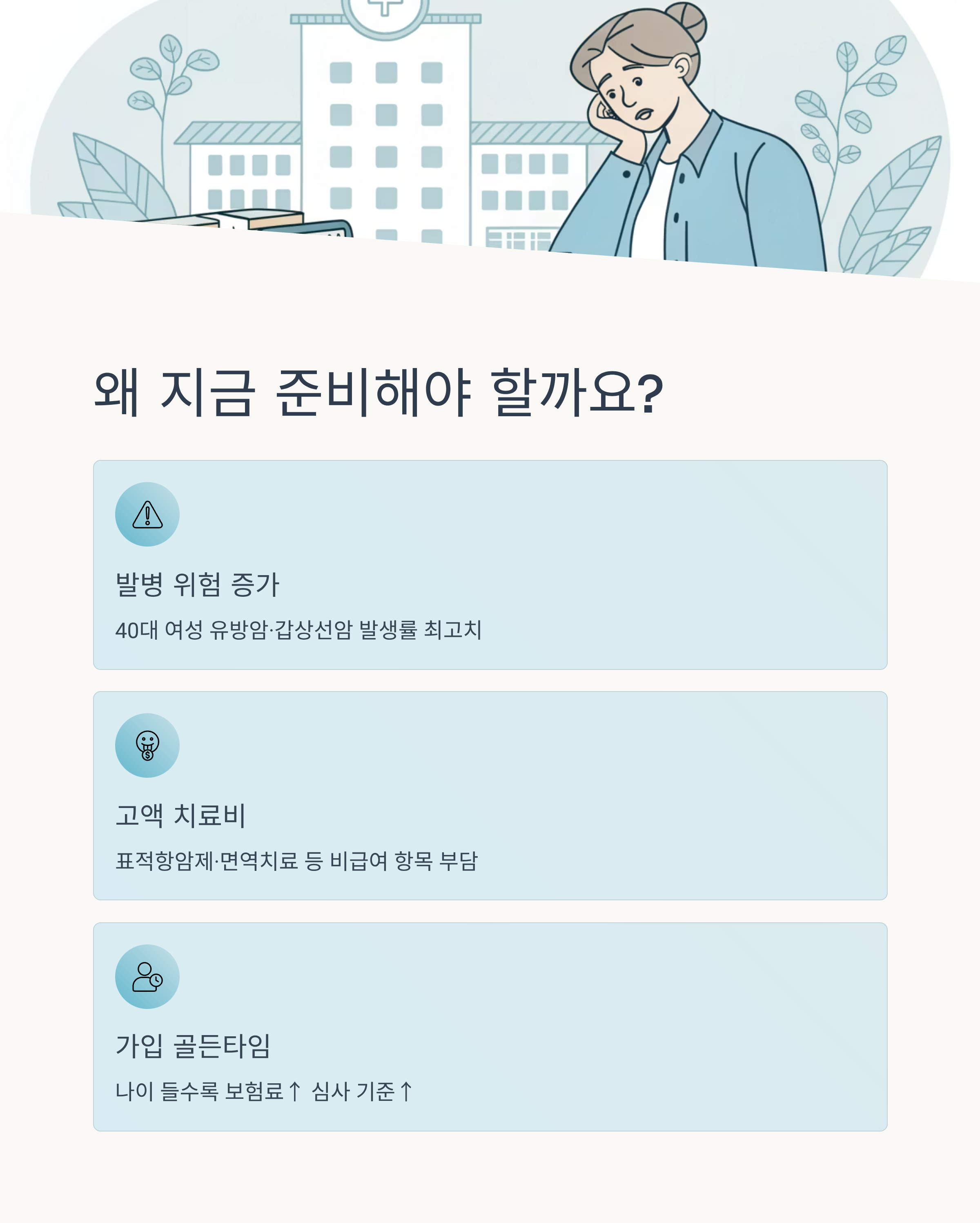 40대 여성이라면 이제 건강에 대해 더욱 현실적인 대비가 필요해요. 특히 암은 누구에게나 찾아올 수 있지만, 40대는 특히 유방암, 갑상선암 등 여성에게 흔한 암 발병률이 높아지는 시기랍니다. 그렇기 때문에 '언제든지 내 일이 될 수 있다'는 생각으로 암보험을 꼼꼼하게 살펴보는 게 중요해요.