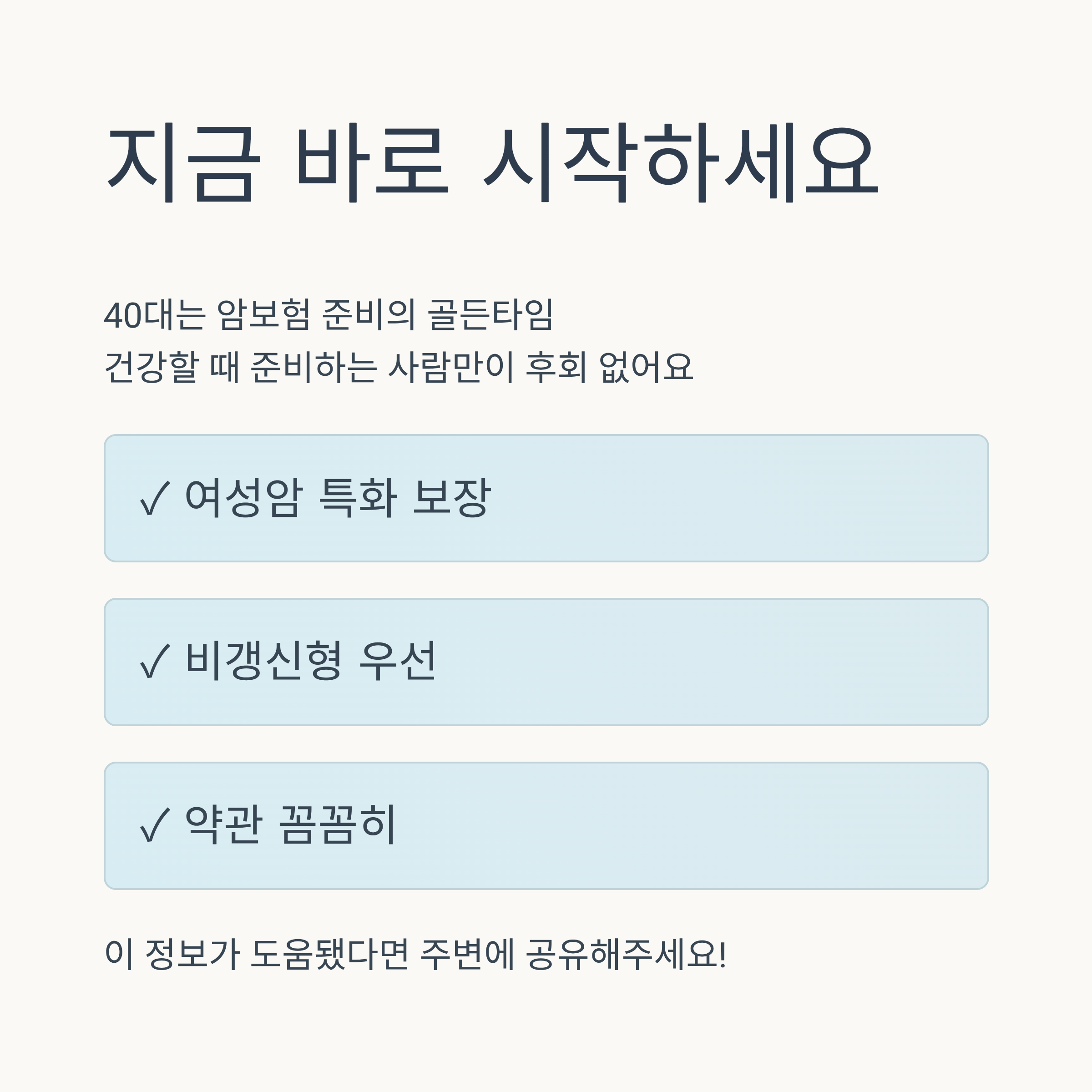 정리하자면, 40대 여성에게 암보험은 단순히 '혹시 모르니까'가 아니라, 매우 현실적인 준비예요. 병원비, 생활비, 가족의 안정까지 모두 책임져야 하는 시기니까요. 본인의 건강을 지키는 가장 실질적인 방법이기도 해요! 🛡️