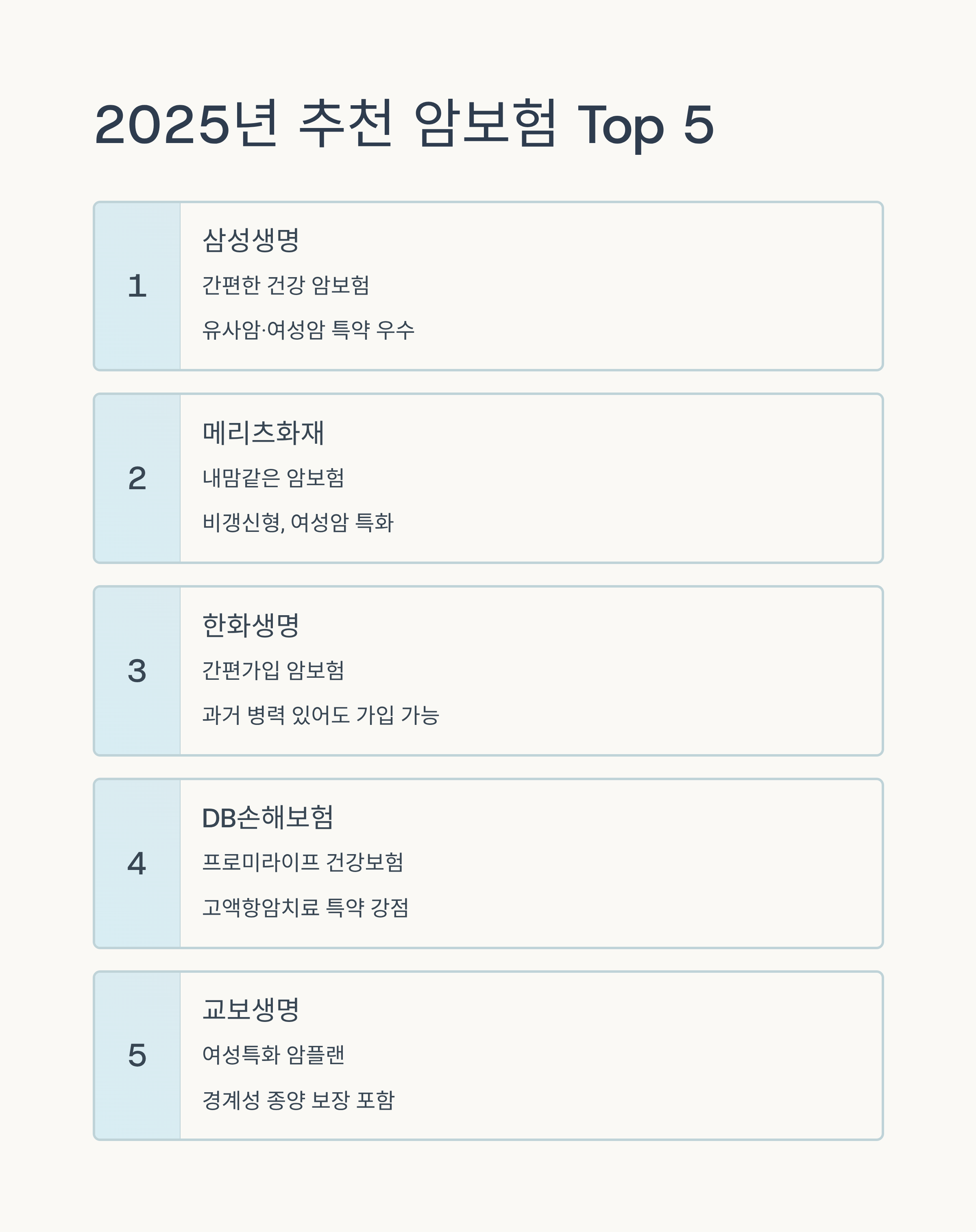 이제 어떤 기준으로 암보험을 고르면 되는지 조금 더 명확해졌죠? 다음 섹션에서는 2025년 기준으로 실제 추천할 만한 암보험 상품 5개를 골라 비교해드릴게요. 어떤 보험사가 어떤 특징을 가지고 있는지 한눈에 정리해볼게요! 💬