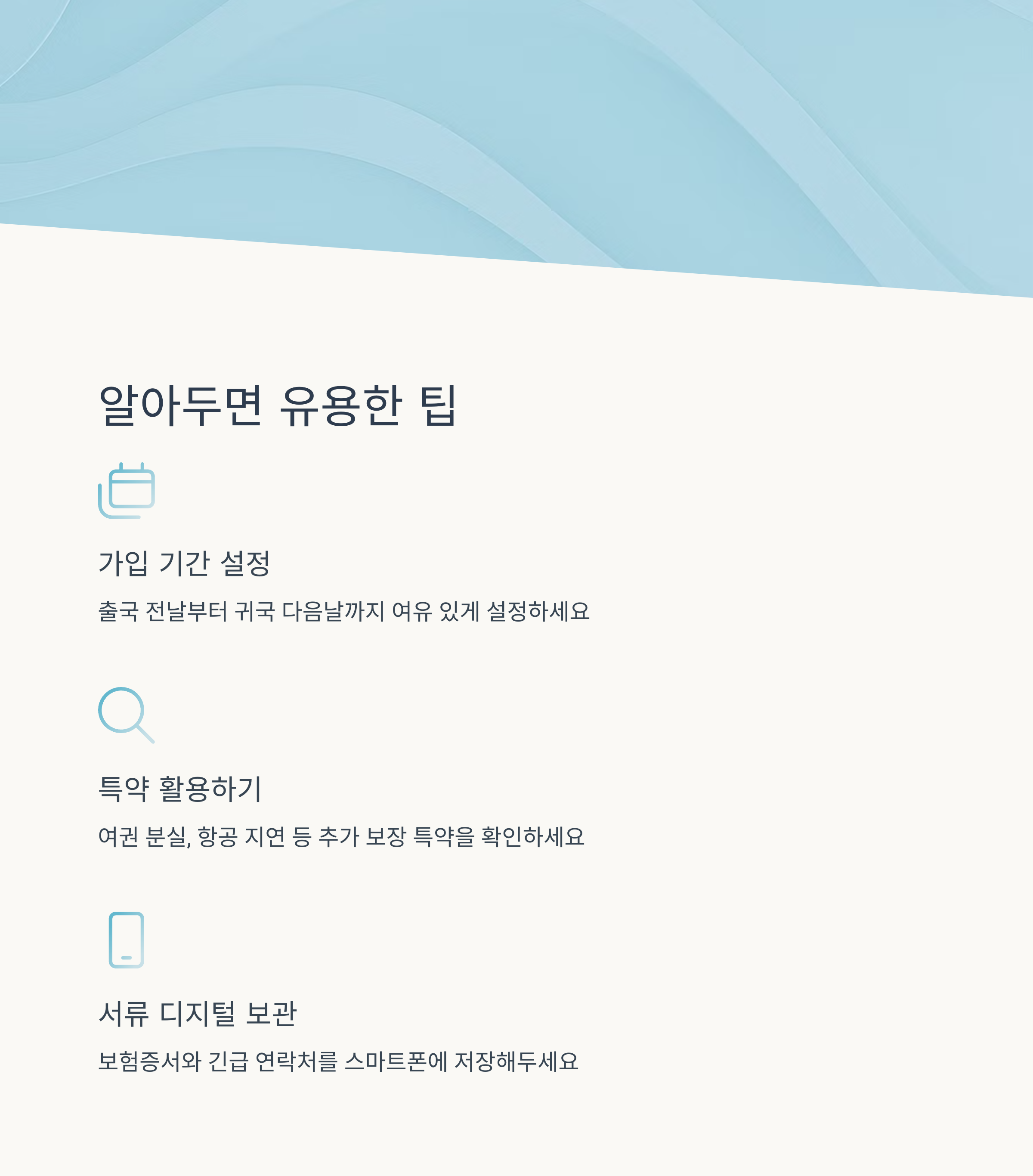 두 번째는 여행 일정과 맞게 보험 기간을 정확히 설정하는 거예요. 출국 날짜와 귀국 날짜에 하루 여유를 두고 가입하면 예상치 못한 연착이나 일정 변경에도 보장을 받을 수 있어요. 어떤 보험은 비행기 탑승 시간 기준으로 보장이 시작되기 때문에 가입일 설정이 정말 중요하답니다.