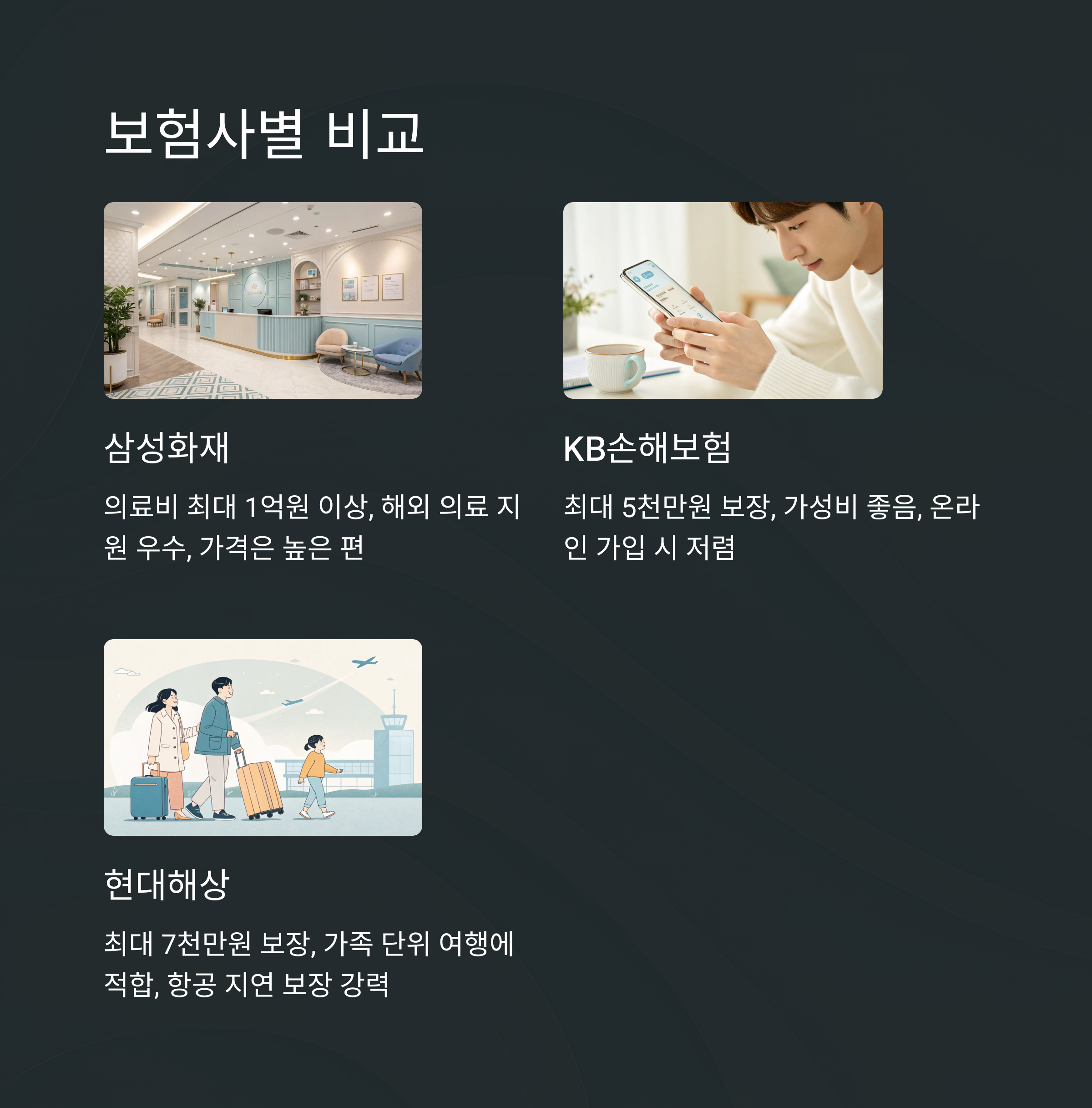 | 현대해상 | 최대 7천만원 | 가족 단위에 적합, 항공 지연 보장 강력 | 중간 수준 |