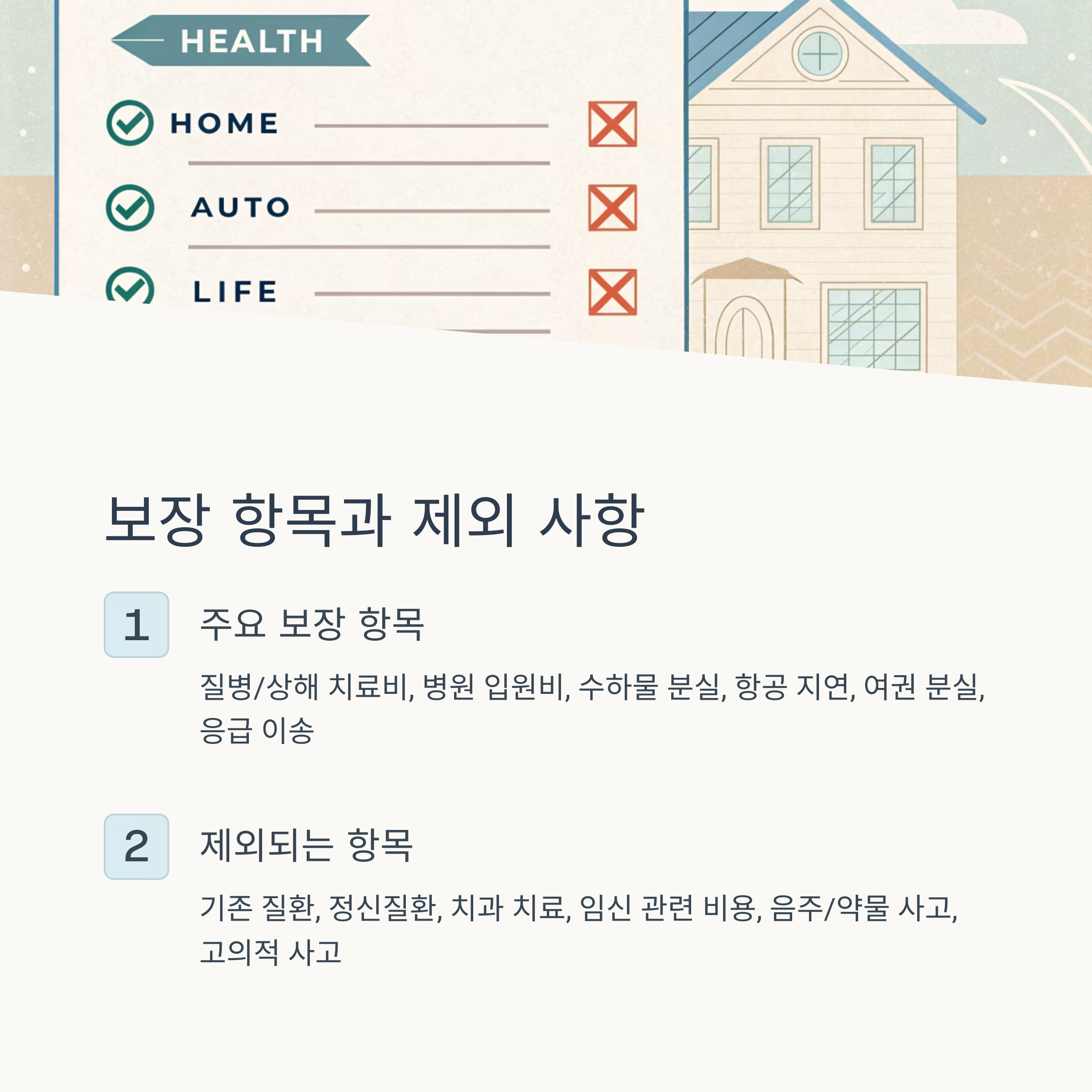 | ❌ 제외 항목 | 기존 질환, 정신질환, 치과 치료, 임신 관련 비용, 음주/약물 사고, 고의적 사고, 고위험 스포츠 |