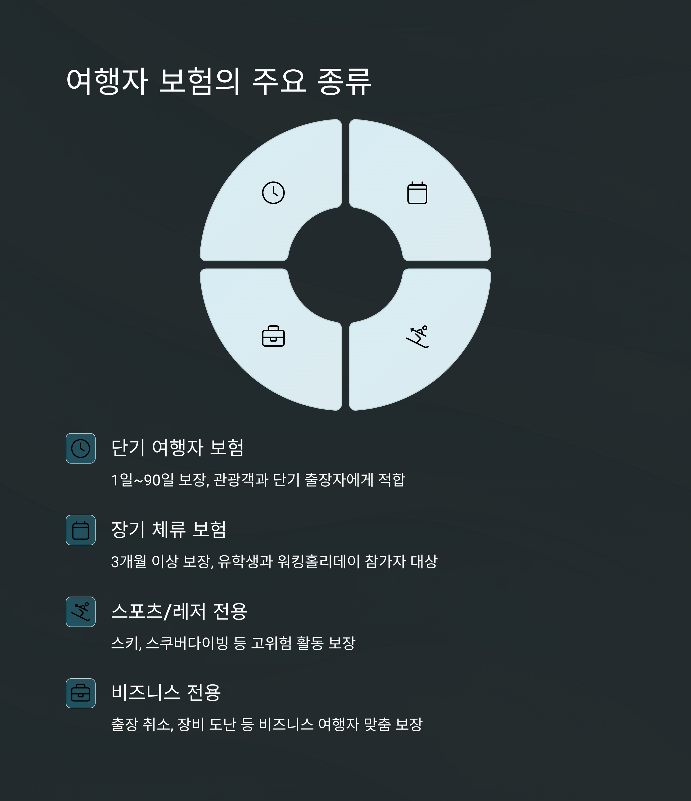 travel insurance는 보장 범위와 목적에 따라 다양한 종류가 있어요. 가장 흔한 구분은 단기 여행자 보험과 장기 체류용 보험이에요. 단기 보험은 휴가나 출장 등 짧은 해외 여행에 적합하고, 장기 보험은 유학, 워킹홀리데이, 해외 취업 등을 위한 거예요.